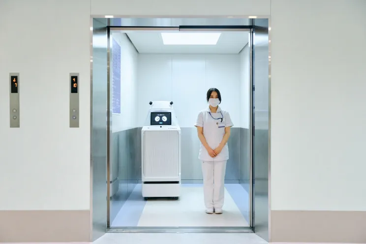 エレベーターでの人との相乗りが可能です。ベッド搬送などでスペースが必要な際は、ロボットを途中階で下車させることもできます。